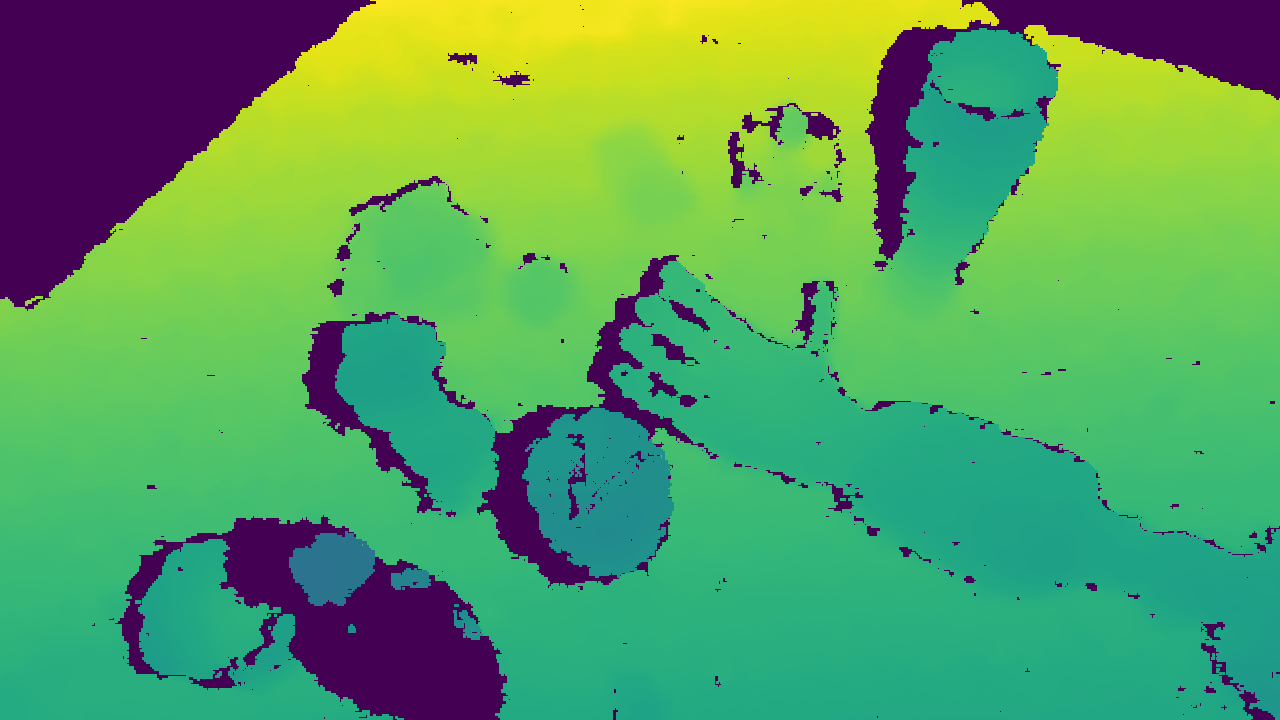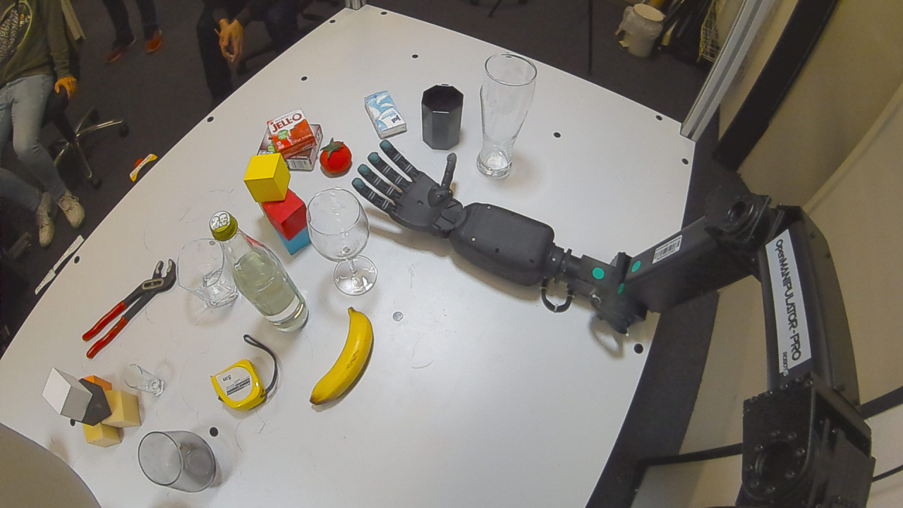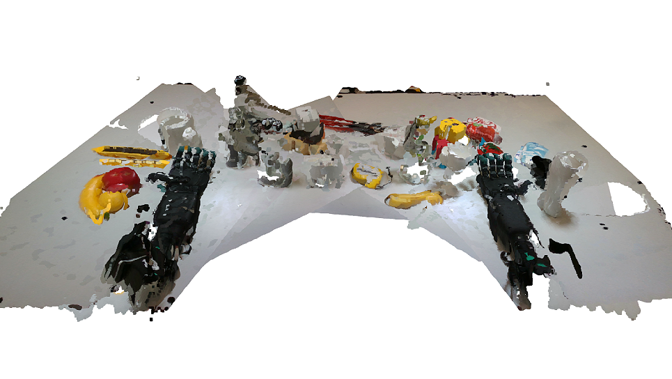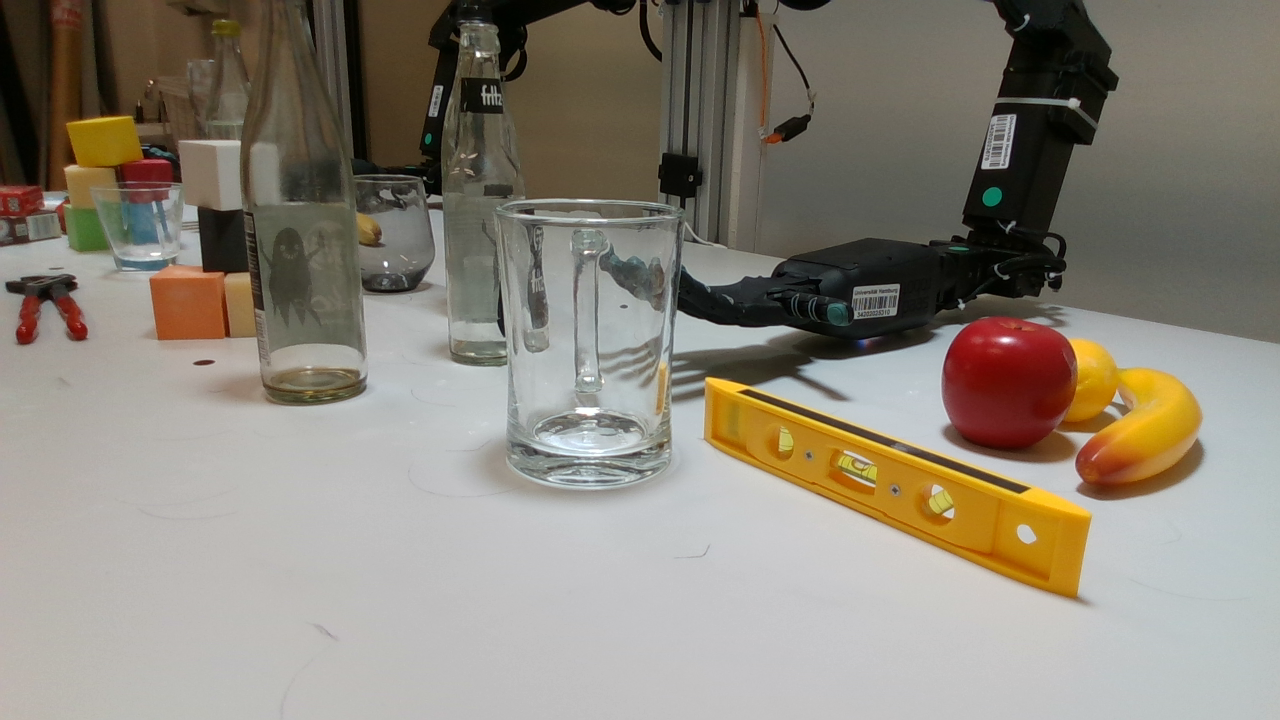 100 scenes with a mix of transparent and non-transparent objects were captured on a 2m x 1m tabletop in front of the NICOL robot. Each scene is scanned three times: (1) with clean glasses, (2) with 3D-printed green caps for height measurement, and (3) with identical glasses sprayed with chalk for ground-truth depth and segmentation.
